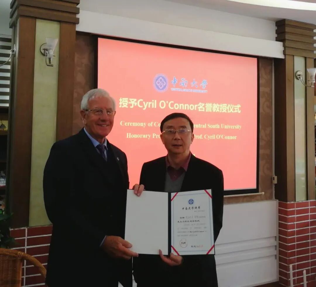 2019年4月12日,美国工程院外籍院士、国际矿物加工理事会主席Cyril O'Connor教授正式接受聘请,成为中南大学名誉教授。图源 中南大学