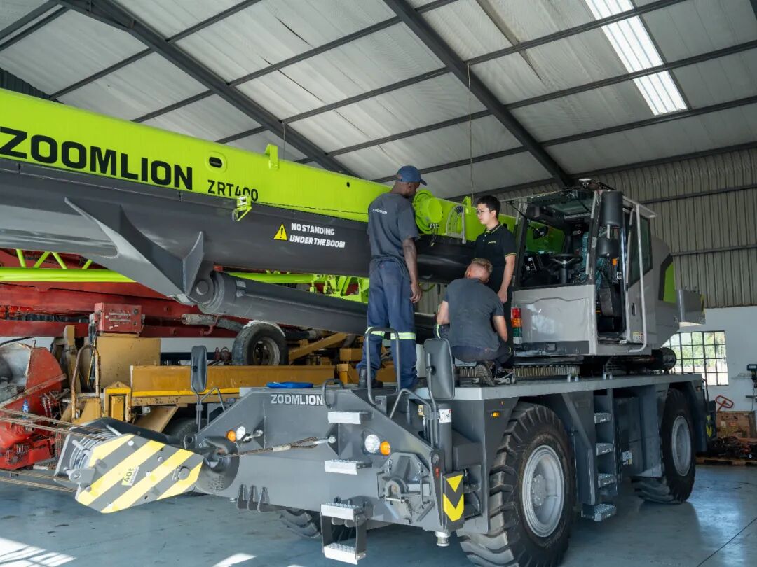 2023年4月26日,南非ZLT起重机公司的一台新款越野轮胎吊前,中联重科中方工程师在给当地服务人员进行交机培训。湖南日报全媒体记者 易昂 曾冠霖 摄