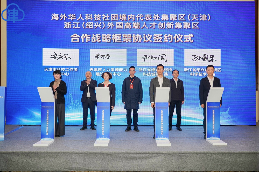 海外华人科技社团境内代表处集聚区(天津)与浙江(绍兴)外国高端人才创新集聚区签署框架合作协议。双方将在高端人才引育、优质项目资源对接、集聚区机制建设等方面深化协同联动,共同探索跨区域人才与科技融合发展的新路径,打造区域合作新典范。