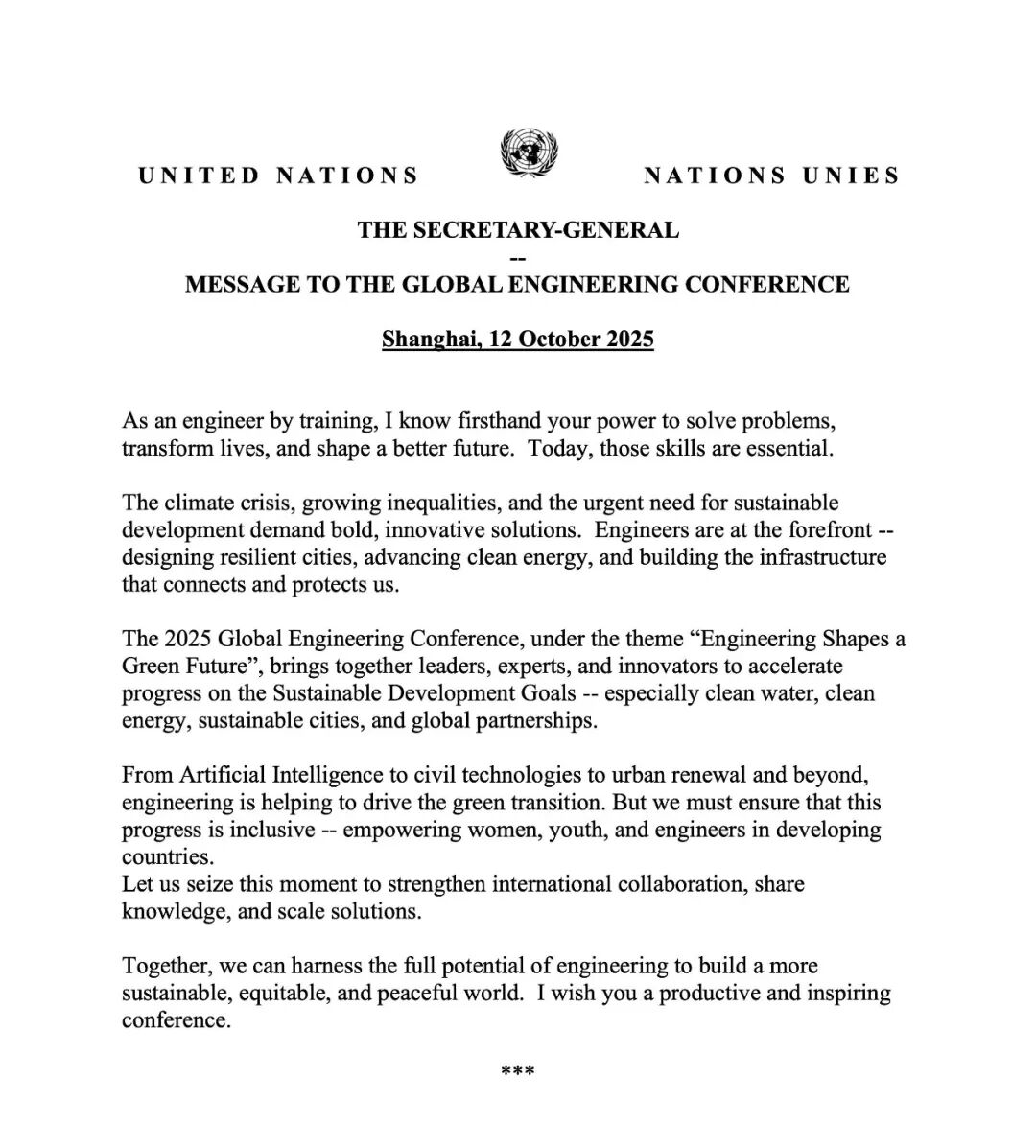 联合国秘书长致世界工程组织联合会全体大会的贺信
