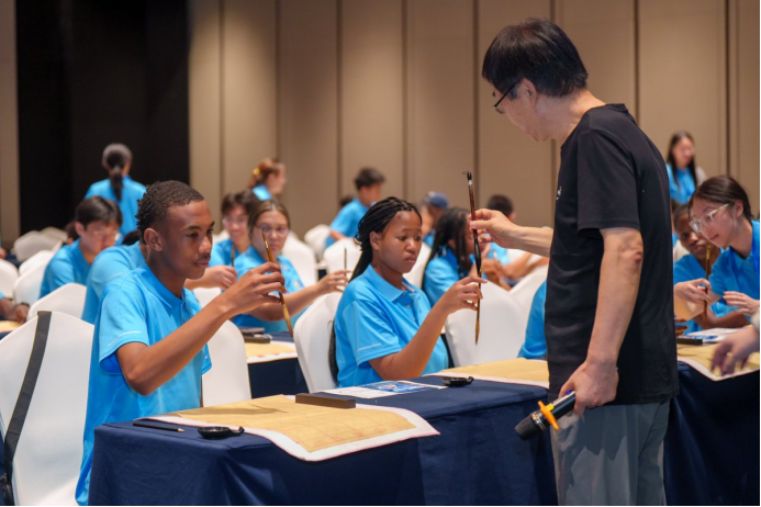创客营活动期间,南非学生学习中国书法