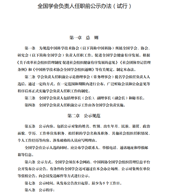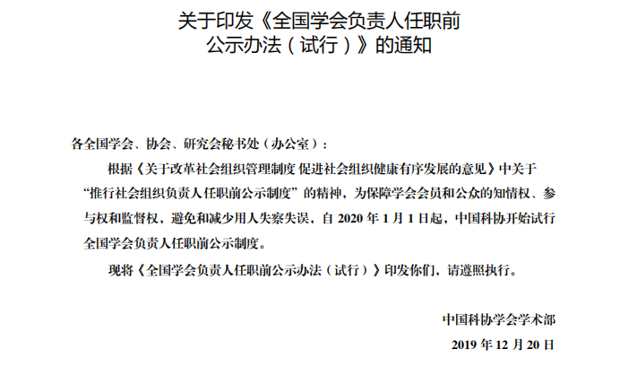 关于印发《全国学会负责人任职前公示办法(试行)》的通知
