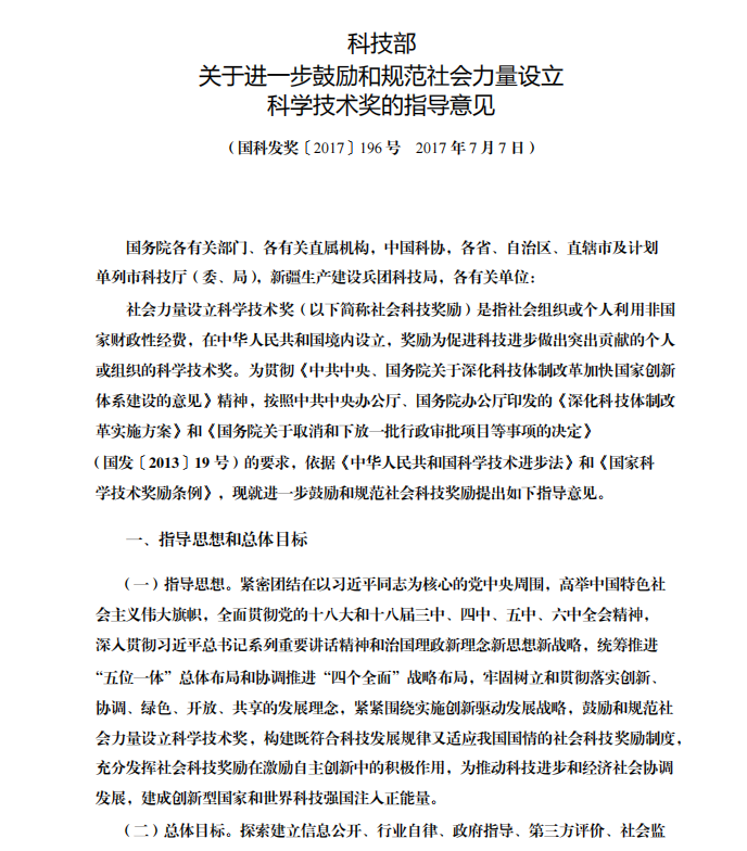 关于进一步鼓励和规范社会力量设立科学技术奖的指导意见
