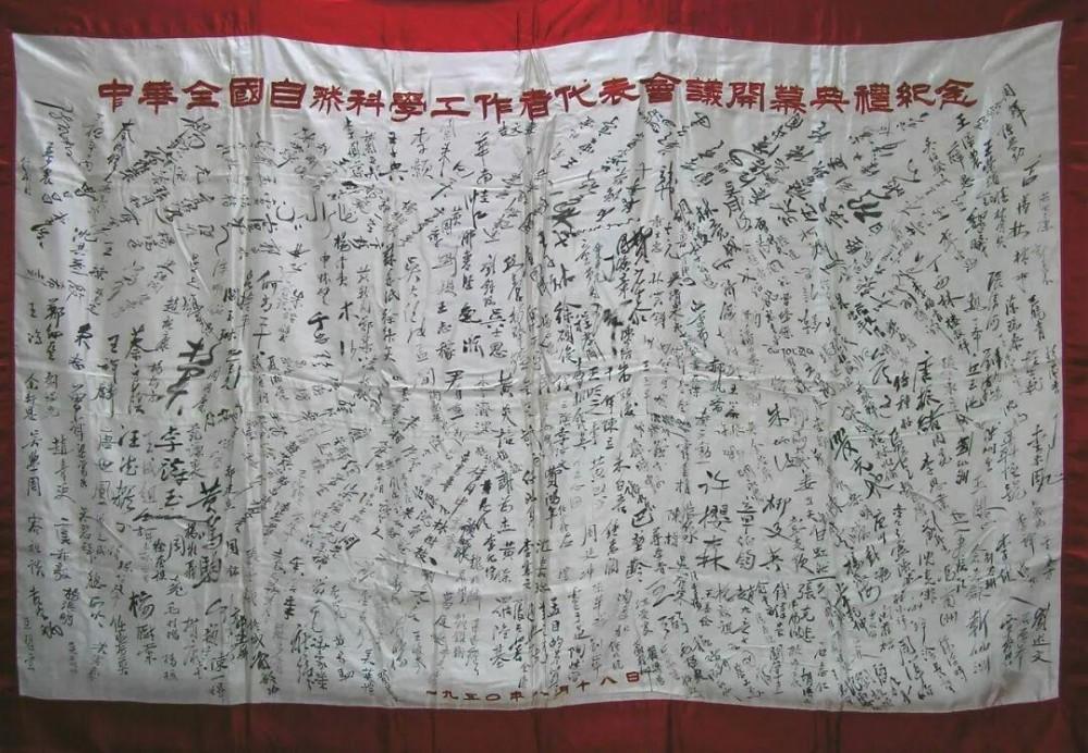 图为1950年8月18日“中华全国自然科学工作者代表会议开幕典礼纪念”签名录。内有周恩来、李济深、黄炎培、李四光、侯德榜、丁西林、竺可桢、吴有训、严济慈、钱三强、华罗庚、茅以升、钱伟长等参会代表的签名
