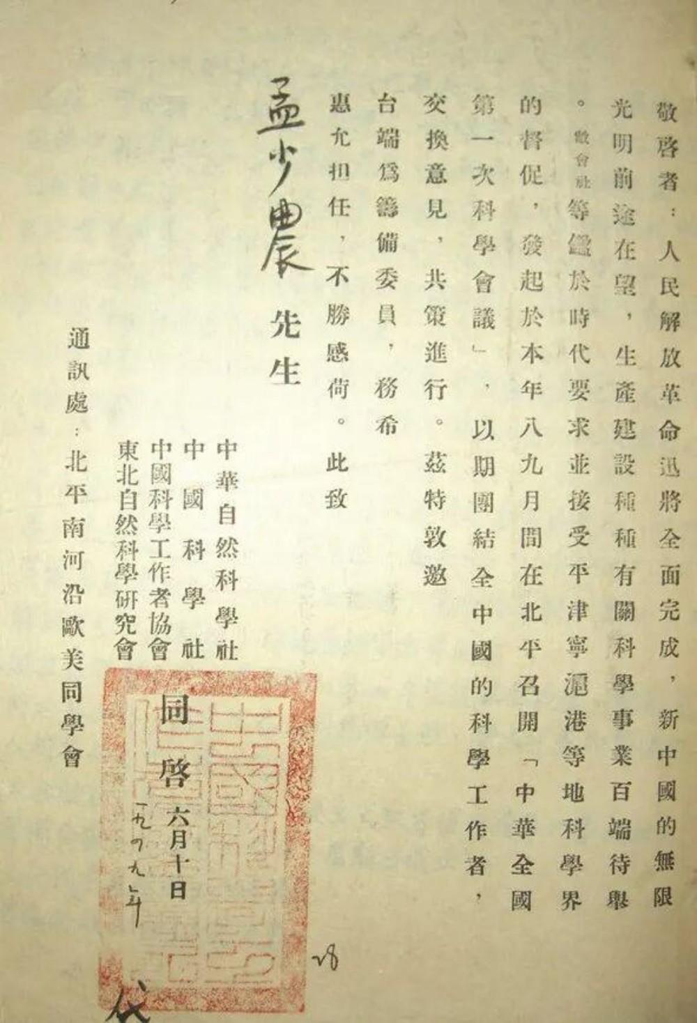 中华全国自然科学工作者代表会议给代表的邀请函