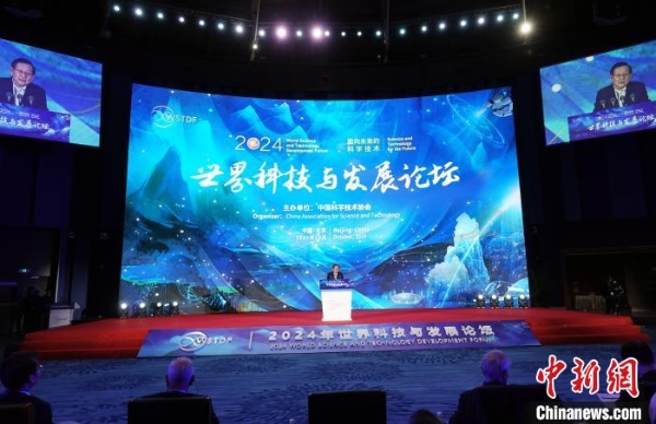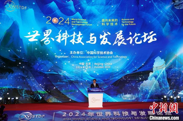 10月22日傍晚,2024年世界科技与发展论坛在北京开幕,论坛主席、中国科协主席万钢做开幕致辞。中新网记者 孙自法 摄