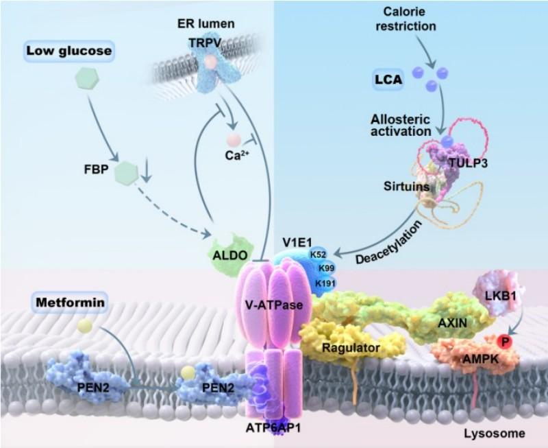 厦门大学生命科学学院林圣彩、张宸崧团队研究发现,卡路里限制后的小鼠血清中数十倍地升高了一种名为石胆酸的成分。石胆酸的投喂能模拟节食效果,在常态饱食的小鼠、线虫、果蝇多种动物中产生促进健康和延缓衰老的作用。该团队还发现了石胆酸的受体,即TULP3,其结合石胆酸之后激活去乙酰化酶Sirtuins,去除质子泵的V1E1亚基上的乙酰基,链接到本实验室发现的溶酶体AMPK通路,并由此起到促健康和抗衰老的作用。该系列研究揭示了人类长期欲寻获的具有延寿的效应分子及其作用机制,为开发能模拟节食效应的干预策略提供了理论基础与新靶点。