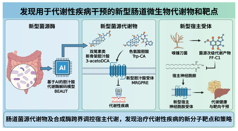 北京大学姜长涛、乔杰、孙金鹏、来鲁华、汪锴等团队合作,发现调控代谢性疾病的新型肠道菌源代谢物、作用机制与干预策略:构建基于AI的菌源特异合成酶挖掘体系,发现并命名新骨架胆酸双尾素、色氨酸胆酸等新型菌源代谢物,揭示孤儿受体MRGPRE等新型胆汁酸受体,是代谢性疾病的新靶点;发现FF-C1等肠道共生真菌新型次级代谢产物,解析其通过调控宿主神经酰胺改善代谢性疾病的作用,并发现神经酰胺新受体,开发靶向干预策略。