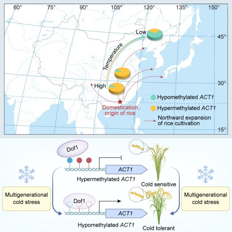 中国科学院遗传与发育生物学研究所曹晓风团队研究发现,连续多代冷胁迫能诱导水稻基因组特定位点发生DNA甲基化变异,不仅直接参与水稻耐冷性状的形成,还可稳定遗传,并在高纬度低温环境适应过程中发挥关键作用。该研究首次为延续两百余年的“获得性遗传”之争提供了关键分子证据,拓展了现代进化理论框架。研究同时开创了定向环境胁迫的抗逆育种新思路,为应对全球气候变化下的农业挑战提供了新方案。研究获Nature、Trends in Plant Science、Molecular Plant及JIPB期刊专评。