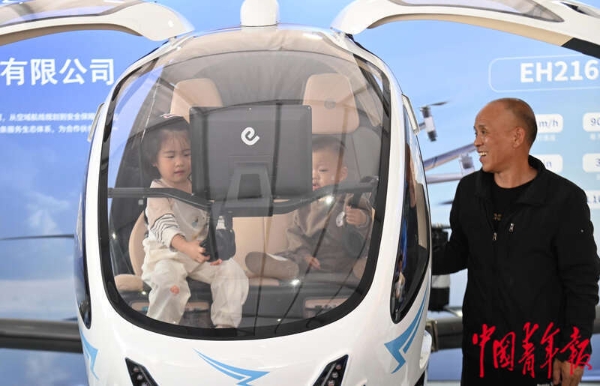 市民带领儿童参观、体验低空飞行器的驾驶舱。中青报·中青网记者 李剑平/摄
