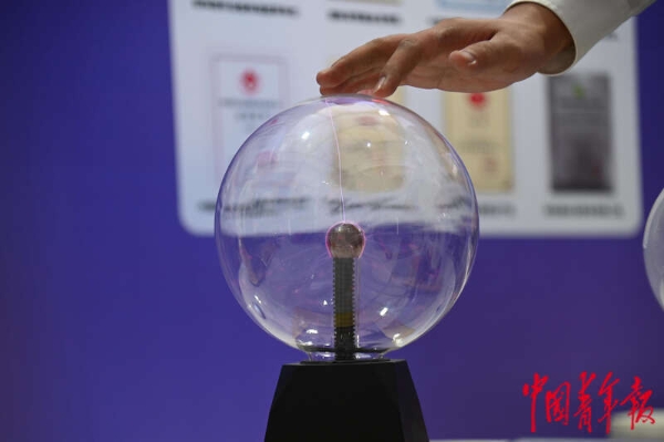 青少年触摸装有惰性气体的魔法水晶球,观察“闪电”的变化。 中青报·中青网记者 李剑平/摄