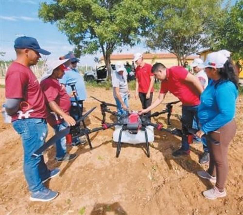在巴西北里奥格兰德州联邦教育科技学院阿波迪校区农场,巴西师生和农户学习操作中国生产的无人机。 迪奥任塞·诺夫雷加摄