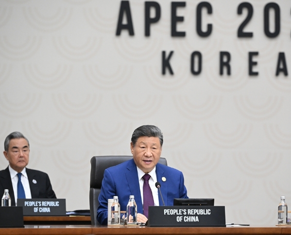当地时间11月1日上午,国家主席习近平在韩国庆州出席亚太经合组织第三十二次领导人非正式会议第二阶段会议,并发表题为《共同开创可持续的美好明天》的重要讲话。新华社记者 谢环驰 摄
