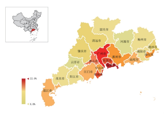 调查结果显示,2020年广东全省21个地市中,深圳市(21.1%)的公民科学素质水平超过20%,进入高质量发展阶段;广州市(17.4%)、东莞市(13.5%)、珠海市(13.4%)等市的公民科学素质水平已超过广东省总体水平,佛山市(12.8%)、汕头市(11.4%)、惠州市(11.1%)、中山市(10.8%)等市的公民科学素质水平已超过全国总体水平(佛山市公民具备科学素质的比例保留两位小数为12.77%,保留一位小数为12.8%);江门市(10.3%)、汕尾市(10.1%)、湛江市(10.0%)的公民科学素质水平超过10%,进入快速提升阶段;潮州市(9.8%)、清远市(9.8%)、肇庆市(9.6%)、韶关市(9.4%)、揭阳市(9.2%)、梅州市(9.2%)、阳江市(9.2%)、茂名市(9.1%)、河源市(8.5%)、云浮市(8.0%)等市的公民科学素质水平均超过5%,进入稳步增长阶段。