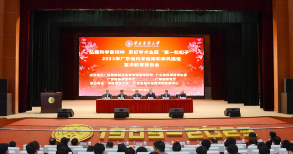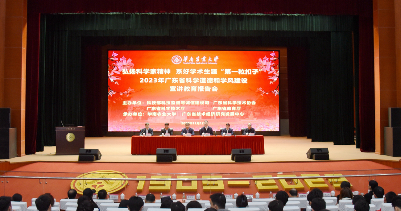 为深入学习贯彻习近平新时代中国特色社会主义思想和党的二十大精神,学习领会习近平总书记关于学风建设和科研诚信建设工作重要指示精神和科学家精神的重要论述,引导广大师生、科技工作者以科教兴国为己任、以老一辈科学家为榜样,做“科学家精神”的践行者,做科研诚信的捍卫者。11月17日,由科技部科技监督与诚信建设司、广东省科协、广东省科技厅、广东省教育厅共同主办,华南农业大学、广东省技术经济研究发展中心联合承办的“弘扬科学家精神 系好学术生涯‘第一粒扣子’”——2023年广东省科学道德和学风建设宣讲教育报告会在华南农业大学丁颖礼堂举行。广东省内各高校、科研院所,省实验室、高水平研究院,以及有关科技型企业等单位5万多名科研人员“线上+线下”同步组织观看学习。
