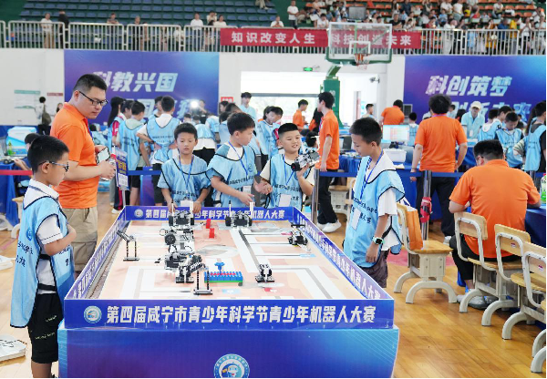 7月3日,第四届湖北省咸宁市青少年科学节青少年机器人大赛在鄂南高中体育馆开赛。来自全市47所学校的795 支队伍、847名青少年选手同台竞技、“机”智对决。