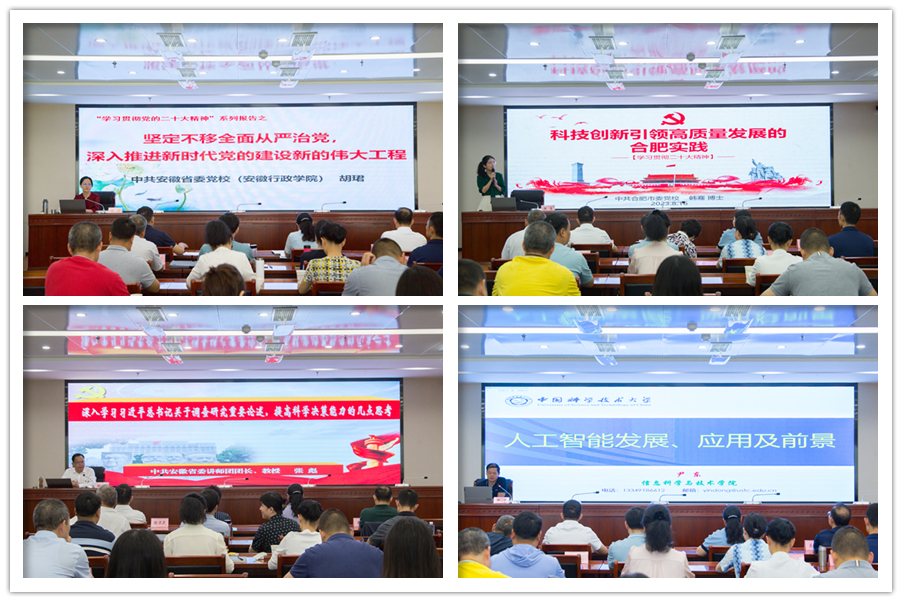 本次培训课程既有专题授课,也有现场教学,突出了互动性、参与性和实用性。专题授课中,安徽省委党校中共党史教研部副主任,副教授胡珺——《坚定不移全面从严治党,深入推进新时代党的建设新的伟大工程》、安徽省委讲师团团长,教授张彪——《深入学习习近平总书记关于调查研究重要论述,提高科学决策能力的几点思考》、中国科学技术大学信息处理中心副主任,副教授尹东——《人工智能的发展应用及前景》,分别进行了授课。几位专家教授授课内容详实、案例丰富,紧跟时代、紧贴实际,具有很强的工作指导性。