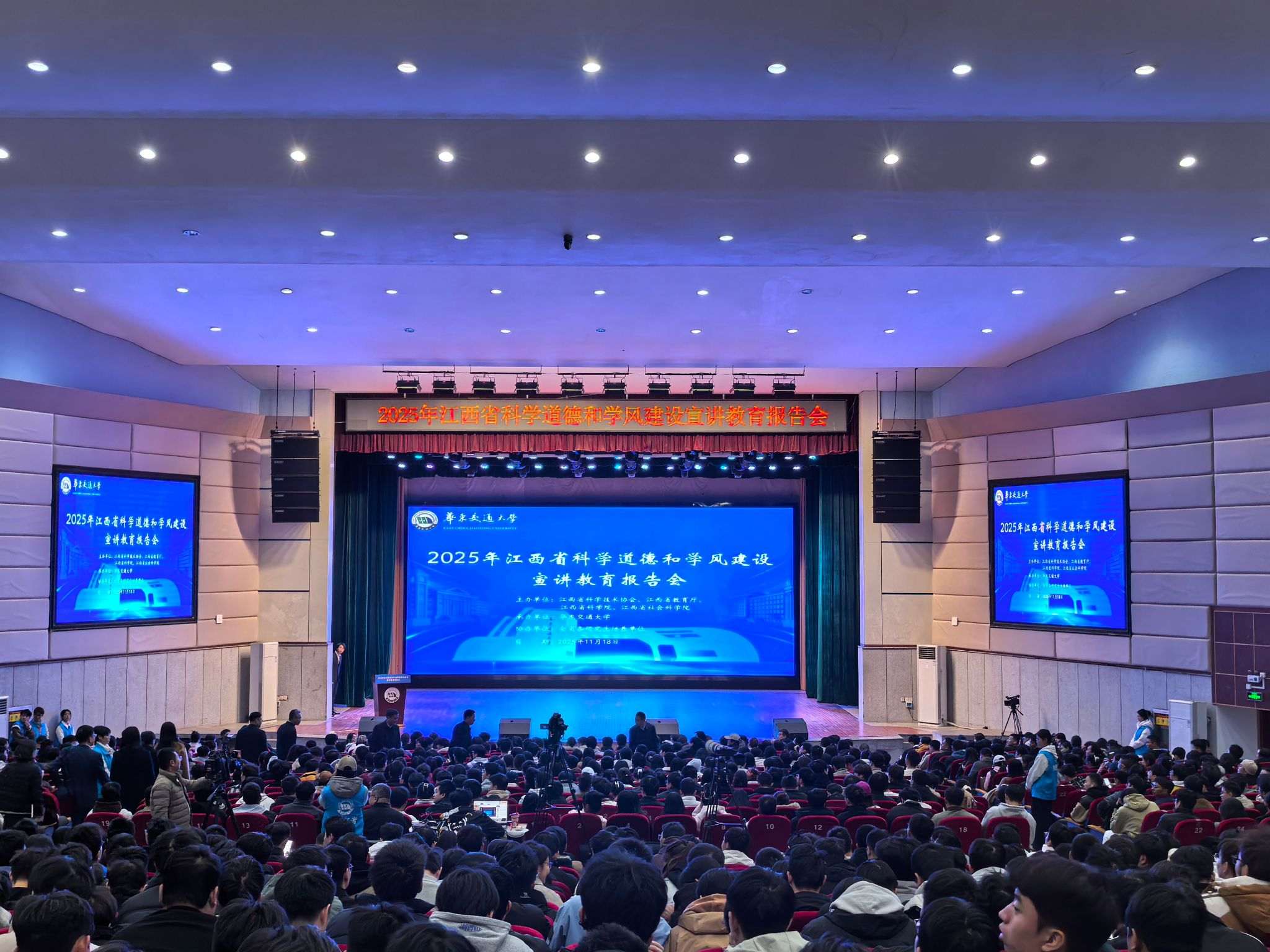 11月18日,2025年江西省科学道德和学风建设宣讲教育报告会在华东交通大学举行。省科协党组成员、副主席章新建,华东交通大学党委委员、副校长肖乾出席并致辞。江西省教育厅二级巡视员雷杰华,江西省科学院党组成员、副院长范敏出席报告会。本次活动由省科协、省教育厅、省科学院、省社科院联合主办,华东交通大学承办,全省各研究生培养单位协办,全省各研究生培养单位研究生院负责人以及研究生代表1200余人在主会场参加报告会,全省各研究生培养单位设立分会场通过线上平台收看。