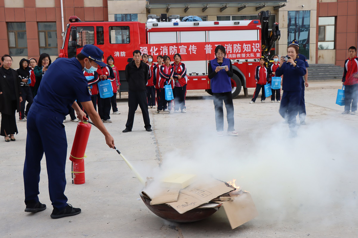 活动现场,消防员向同学们详细介绍干粉灭火器、泡沫灭火器、二氧化碳灭火器、1211灭火器的区别,讲解发生火灾后自防、自救及逃生技能,指导大家如何正确使用灭火器,如何识别消防安全标志以及发生火灾后如何报警等消防安全知识,并现场演示灭火器“一摇、二拔、三瞄、四扫”操作要领。