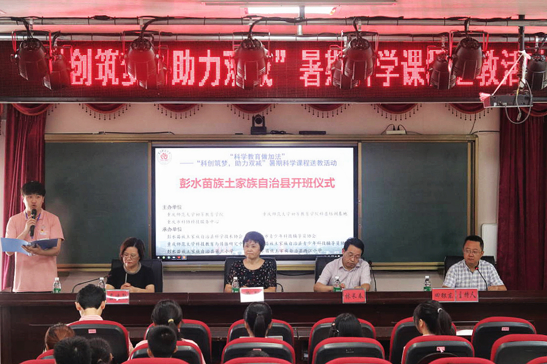 7月4日至9日,“科创筑梦·助力双减”暑期科学课程送教活动在重庆市丰都县和彭水县开展。重庆师范大学初等教育学院科普培训基地主任、科学教育专业首席专家林长春,重庆市科协科技服务中心副主任曹敏,丰都县科协党组书记刘元伟,丰都县科协主席杨文臣,丰都县教委主任代海门,彭水自治县科协副主席田银东等出席活动开班仪式。