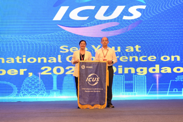 大会主旨报告结束后,大会举行了承办单位交接仪式。本届大会承办方代表江苏理工学院副校长叶霞将大会会旗转交给2026第九届IEEE国际无人系统大会承办方代表哈尔滨工程大学副教授朱仲本。