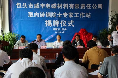 6月16日,内蒙古包头市威丰电磁材料有限责任公司取向硅钢院士专家工作站举行揭牌仪式。中国金属学会不锈钢与耐热钢学术委员会主任委员、电工钢学术委员会副主任委员、中国工程院院士王一德,北京科技大学教授张文康,内蒙古科协党组成员、副主席乌日吉图,内蒙古科技厅副巡视员、内蒙古科协常委云涛,内蒙古党委组织部人才处副处长张得伟,包头市政府、市委组织部、科协、科技局、经信委、稀土高新区、包头市威丰公司领导和有关人员出席揭牌仪式。揭牌仪式由云涛主持。包头市威丰电磁材料有限责任公司董事长刘鹏程致欢迎辞。